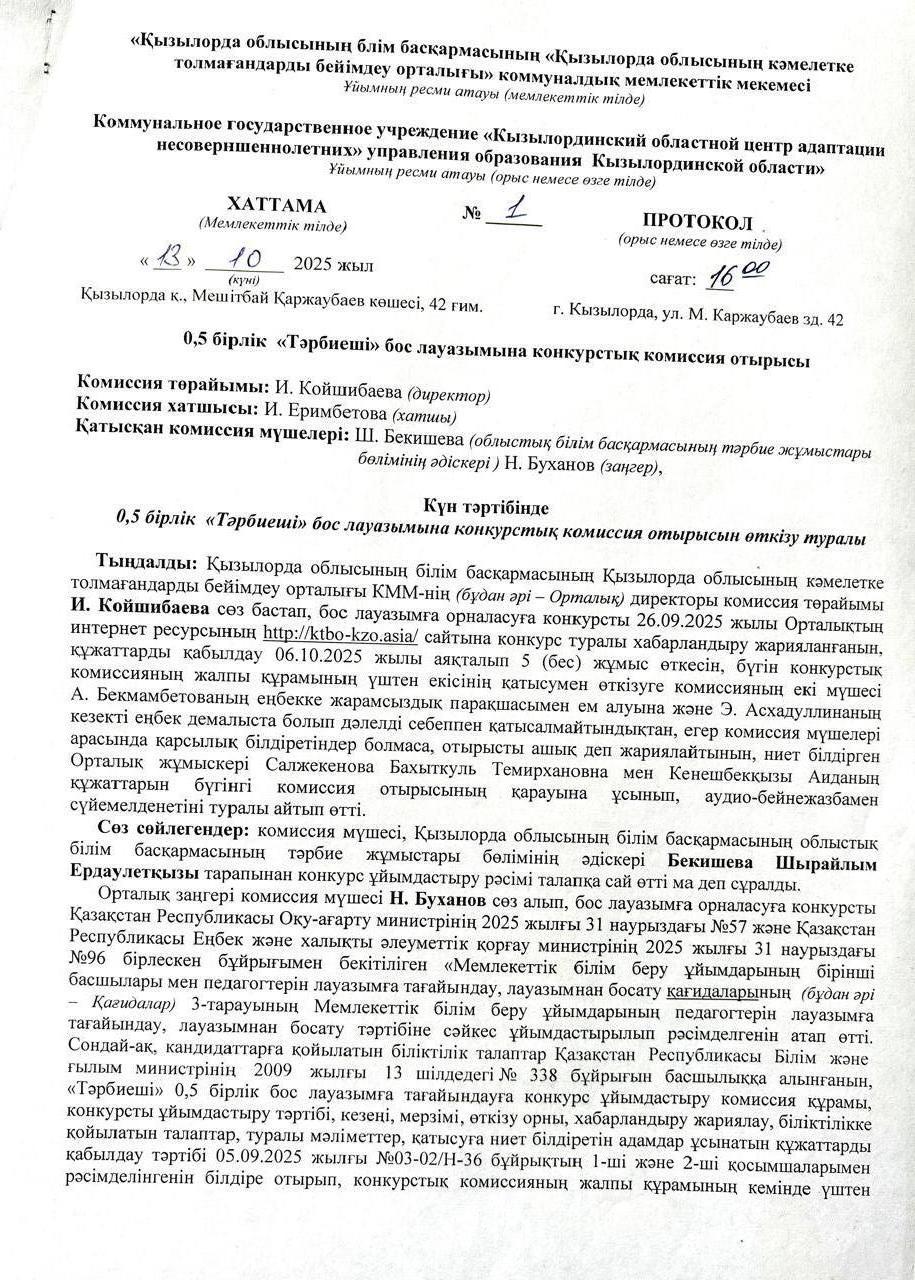 Конкурс Қызылорда облысы, индекс 120023, Қызылорда қаласы, Мешітбай Қаржаубаев көшесі, № 42 ғим. «Қызылорда облысының білім басқармасының Қызылорда облысының кәмелетке толмағандарды бейімдеу орталығы» коммуналдық мемлекеттік мекемесінде Қазақстан Республикасы Оқу-ағарту министрінің 2025 жылғы 31 наурыздағы № 57 және Қазақстан Республикасы Еңбек және халықты әлеуметтік қорғау министрінің 2025 жылғы 31 наурыздағы №96 бірлескен бұйрығына сәйкес конкурс өткізу тәртібі талаптары бойынша өткізіледі.